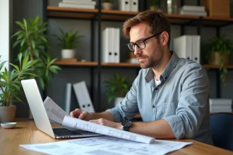 Homme d'âge moyen examinant factures et plans de rénovation